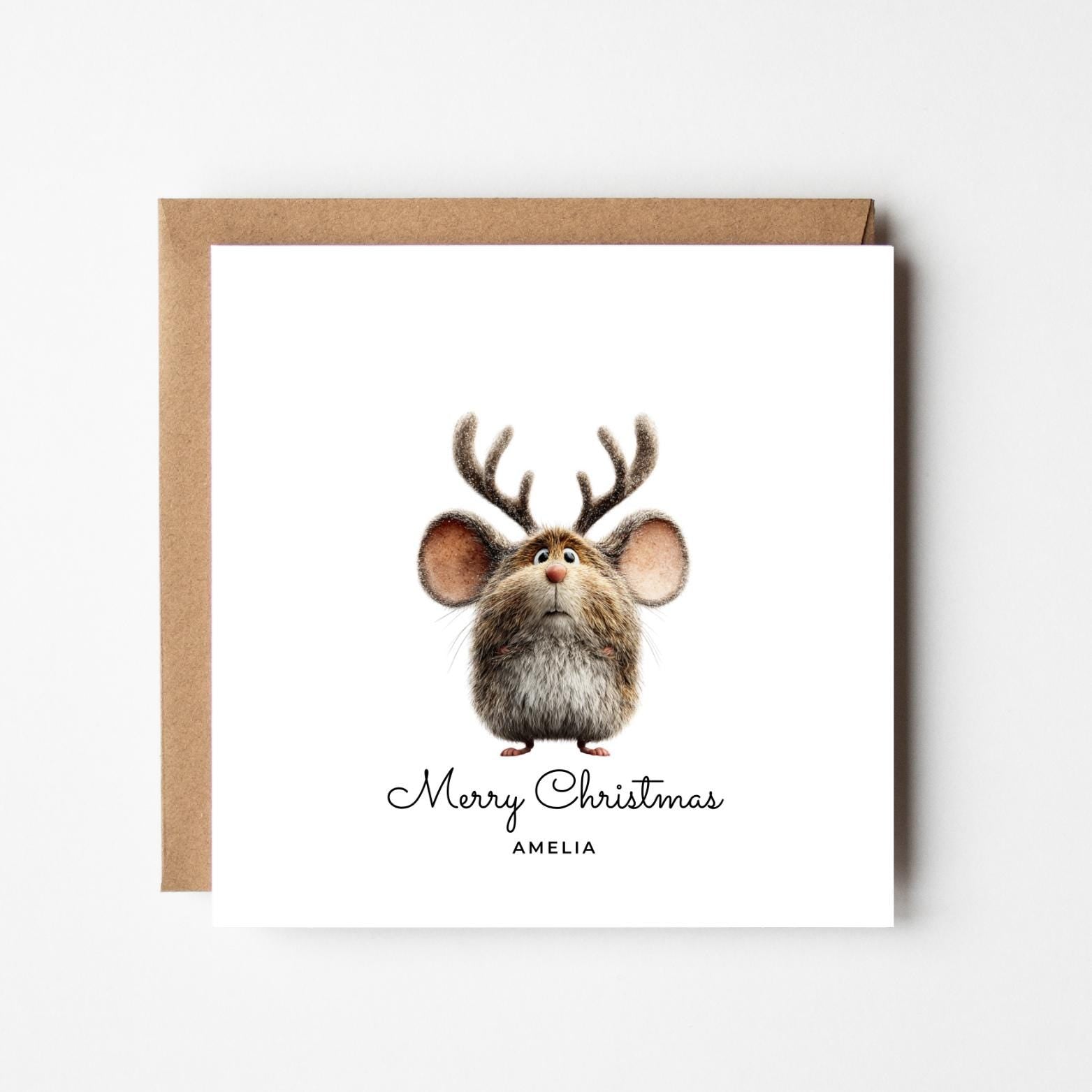 Cute Mouse with Antlers Personalised Christmas Card – Custom Name Holiday Greeting – Funny Animal Xmas Card – Handmade Festive Card