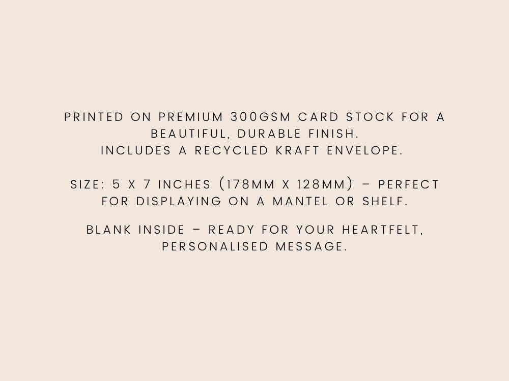 Each card is lovingly handmade just for you. Because we care about quality, we may make tiny adjustments to the layout or design when printing to make sure your card looks its very best. These small tweaks simply help us give you the cleanest, most beautiful finish possible.