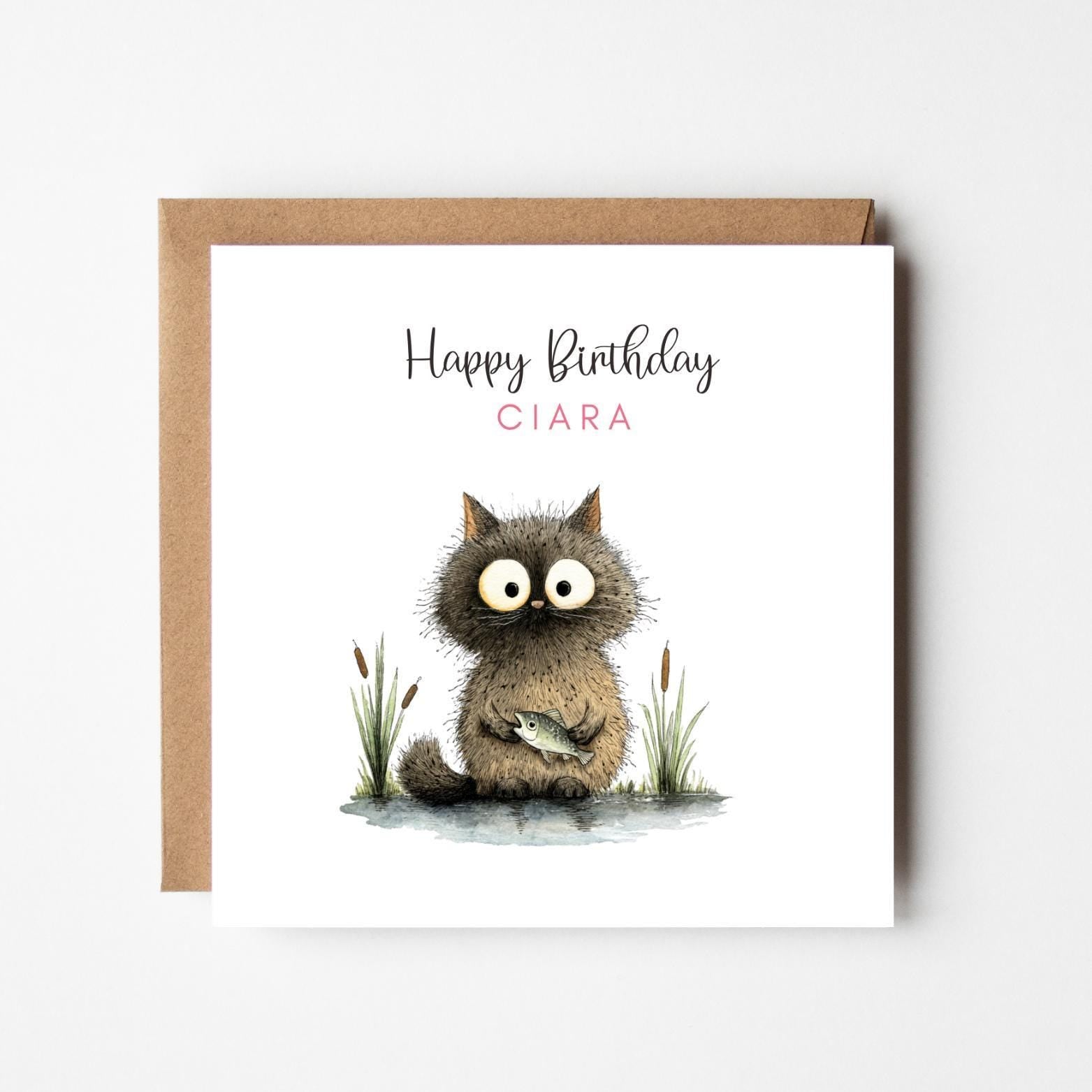 Personalised Fishing Cat Birthday Card – Quirky Cat Lover Greeting