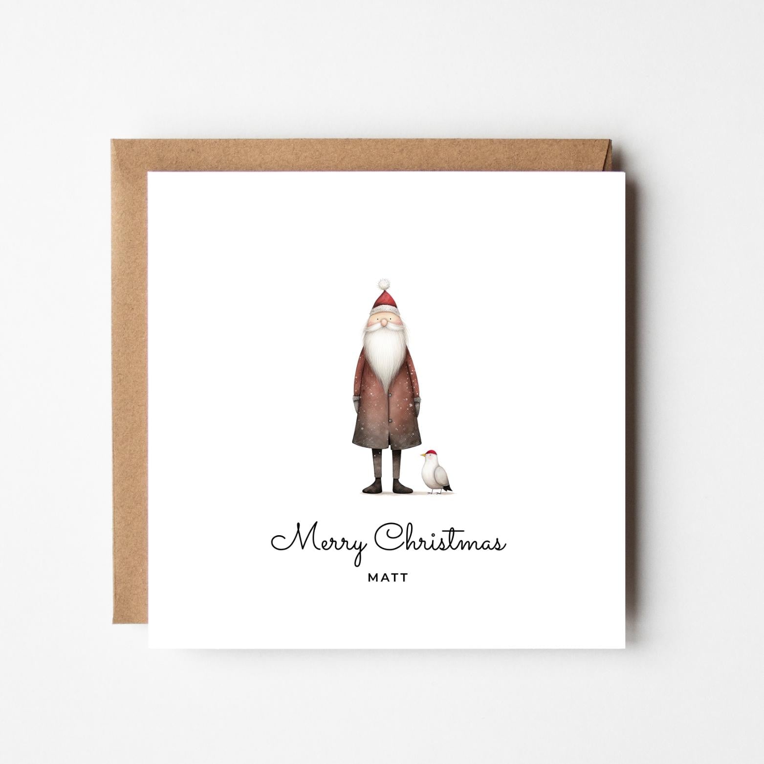 Personalised Santa Christmas Card – Cute Santa with Robin Illustration – Custom Name Festive Holiday Greeting Card – Merry Christmas Card