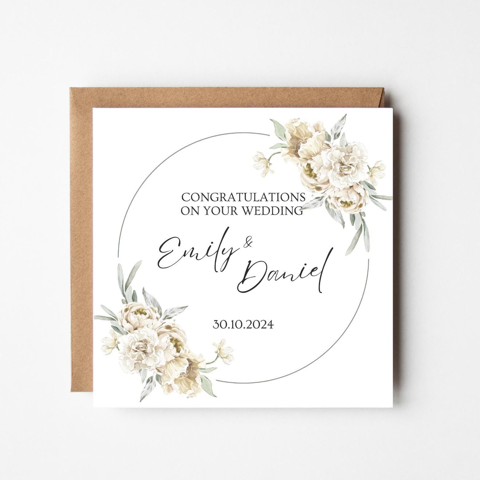 Personalised Wedding Congratulations Card – Custom Names & Date, Elegant Floral Wreath Design, Handmade Wedding Keepsake
