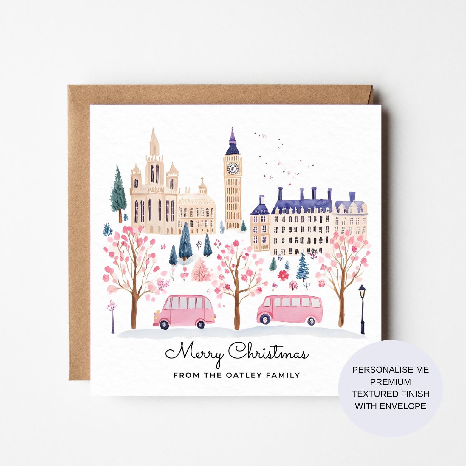 Experience the magic of Christmas with this personalised card, capturing the heart of London in a snowy winter scene. This luxury Christmas card blends festive charm with iconic British landmarks, making it a perfect keepsake for the holiday season. Designed with care, this personalised xmas card brings warmth and joy to your loved ones in a uniquely London style.