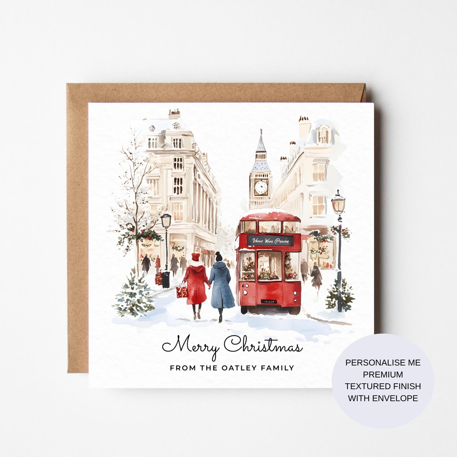 Experience the festive spirit with this personalised Christmas card, beautifully capturing the charm of London’s winter magic. Featuring a delicate watercolour illustration, this luxury card blends iconic London scenes with a warm, merry Christmas vibe. Crafted for those who cherish personalised xmas greetings, it’s a unique way to send heartfelt wishes this season.